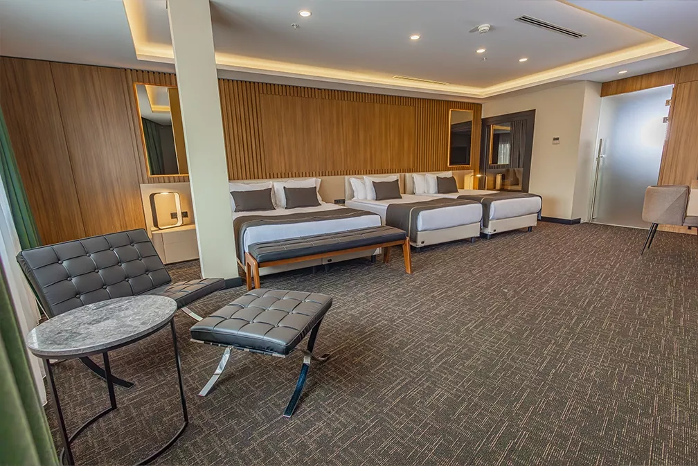 Modern mobilyalarla rahatınız için özenle döşenmiş, banyosunda jakuzi ve saunası ile vip hizmet alacağınız Junior Suit odalarımız eşsiz bir konaklama deneyimi için sizleri bekliyor.