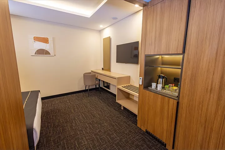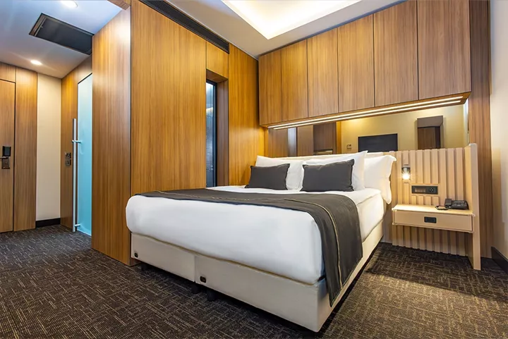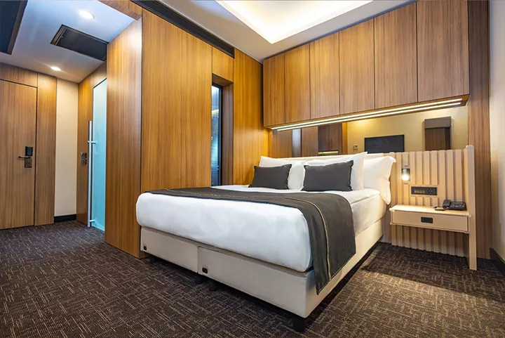 20 metrekarelik engelli dostu odamız, konfor ve zarafetin mükemmel uyumunu sunmaktadır. Modern tasarımı ve işlevsel düzeni ile dikkat çeken bu özel oda, misafirlerimizin tüm ihtiyaçlarını karşılamak üzere özenle donatılmıştır. Özel olarak tasarlanmış yatak odası alanı, mobilyaları, banyo alanı, engelli misafirlerimizin konforunu maksimum seviyede sağlamak üzere düzenlenmiştir.