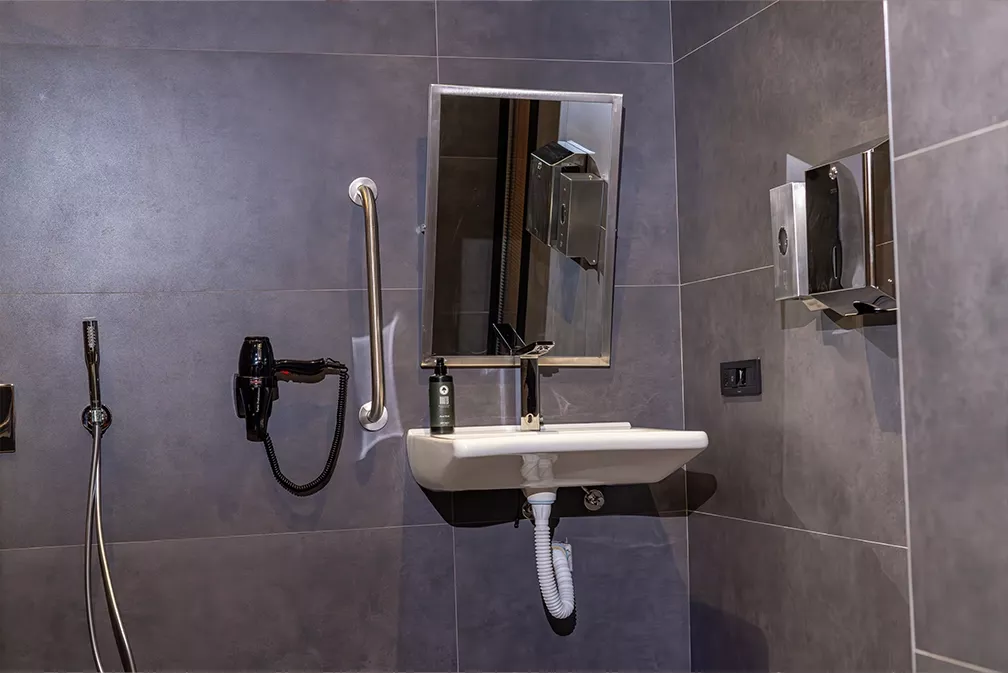 Engelli odası banyosu, tekerlekli sandalye erişimine uygun lavabo, geniş duş alanı, güvenli tutunma barları ve acil çağrı butonu gibi özelliklerle donatılmıştır. Engelli dostu oda, her detayı düşünülerek hazırlanmış olup, konforlu ve keyifli bir konaklama deneyimi sunar.